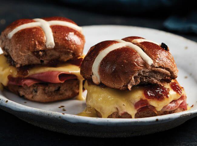Hot Cross Bun Toasties with Brie, Prosciutto and Fig Chutney
